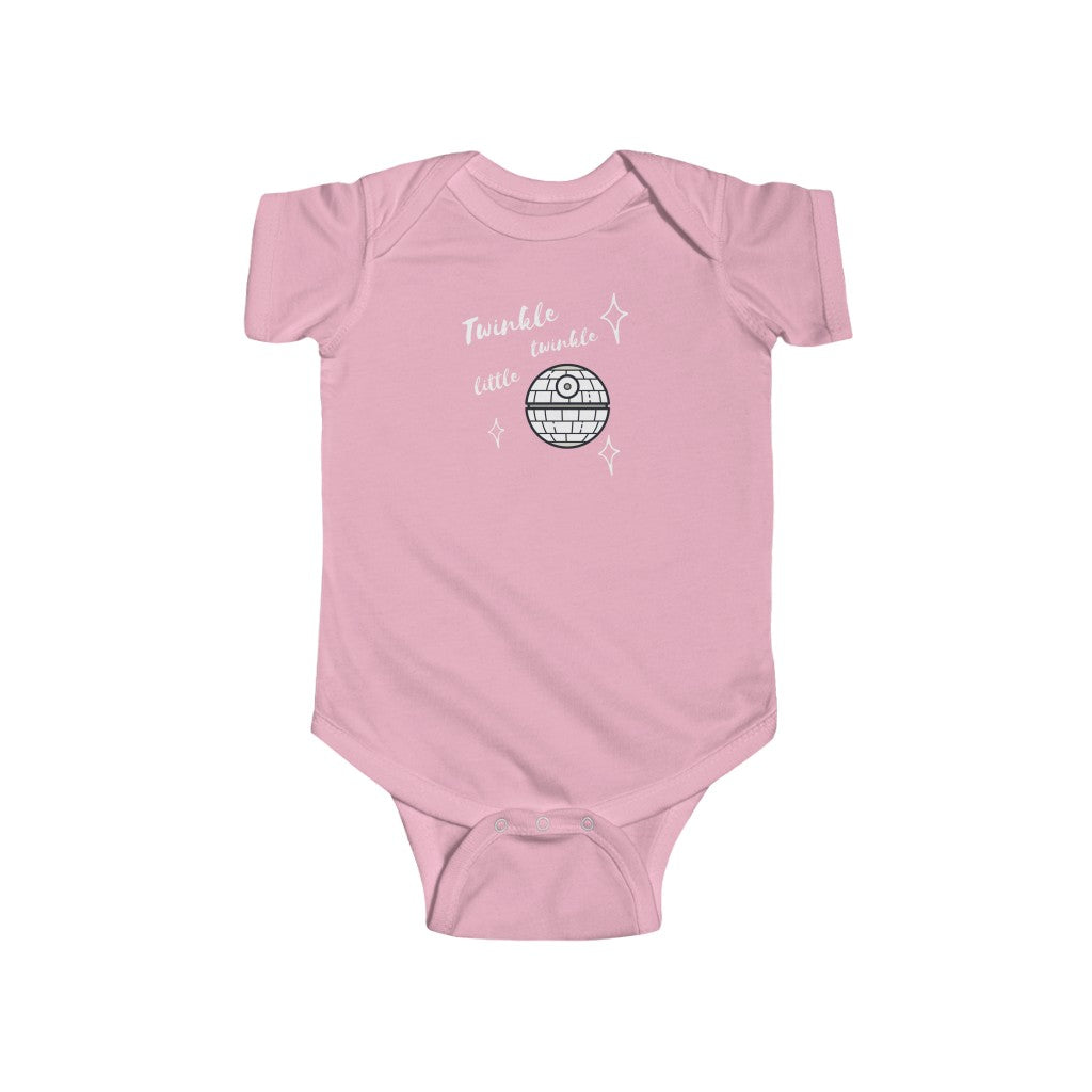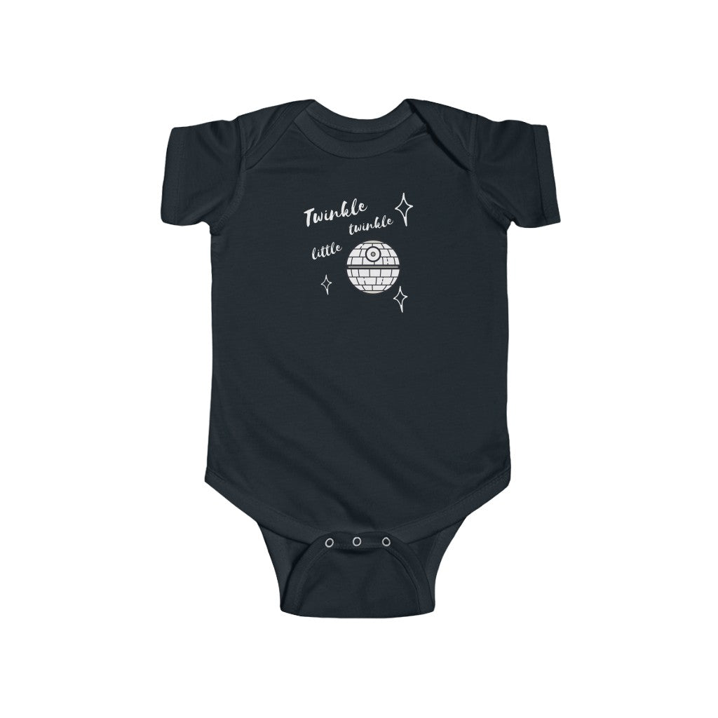 Twinkle, Twinkle Little Death Star is the perfect onesie for all future Star Wars fans out there! Makes a great gift too. Baby clothing needs to be both durable and soft. The fabric is 100% cotton for solid colors. For heather colors, polyester is included. There are seams along the sides of this product. All bindings are made with ribbed knitting for improved durability. There are plastic snaps at the cross closure for easy changing access.